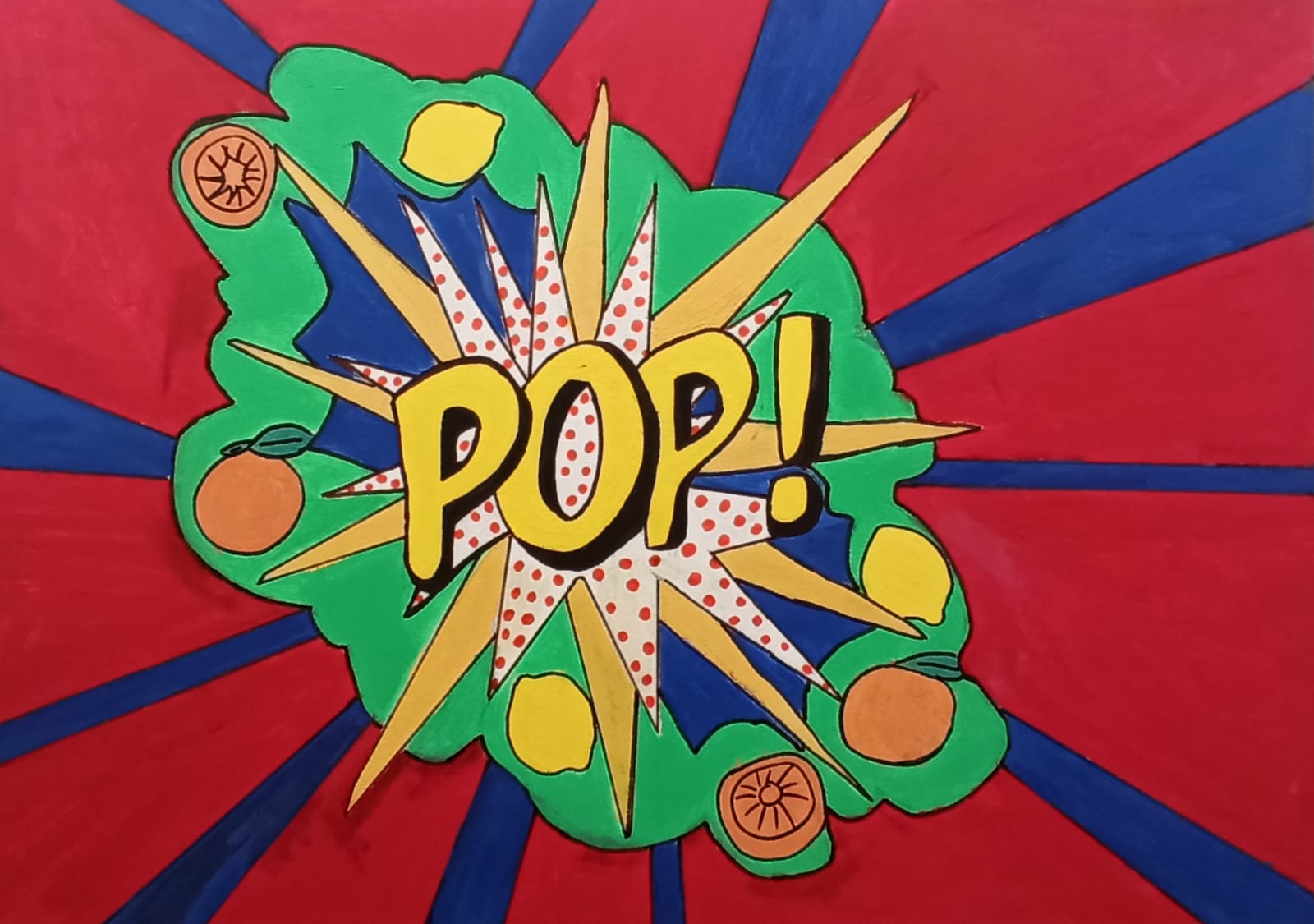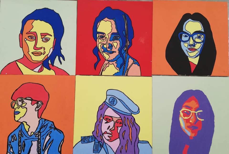 Autoritratti PoP - Solarizzazione di una propria foto e rielaborazione cromatica su tavoletta 30x30 cm in stile pop art. L'insieme dei ritratti individuali andranno composti in pattern in un unico grande pannello che via via si andrà ampliando con tutti gli allievi che man mano frequenteranno il laboratorio - Tecnica: idropittura su tavola.