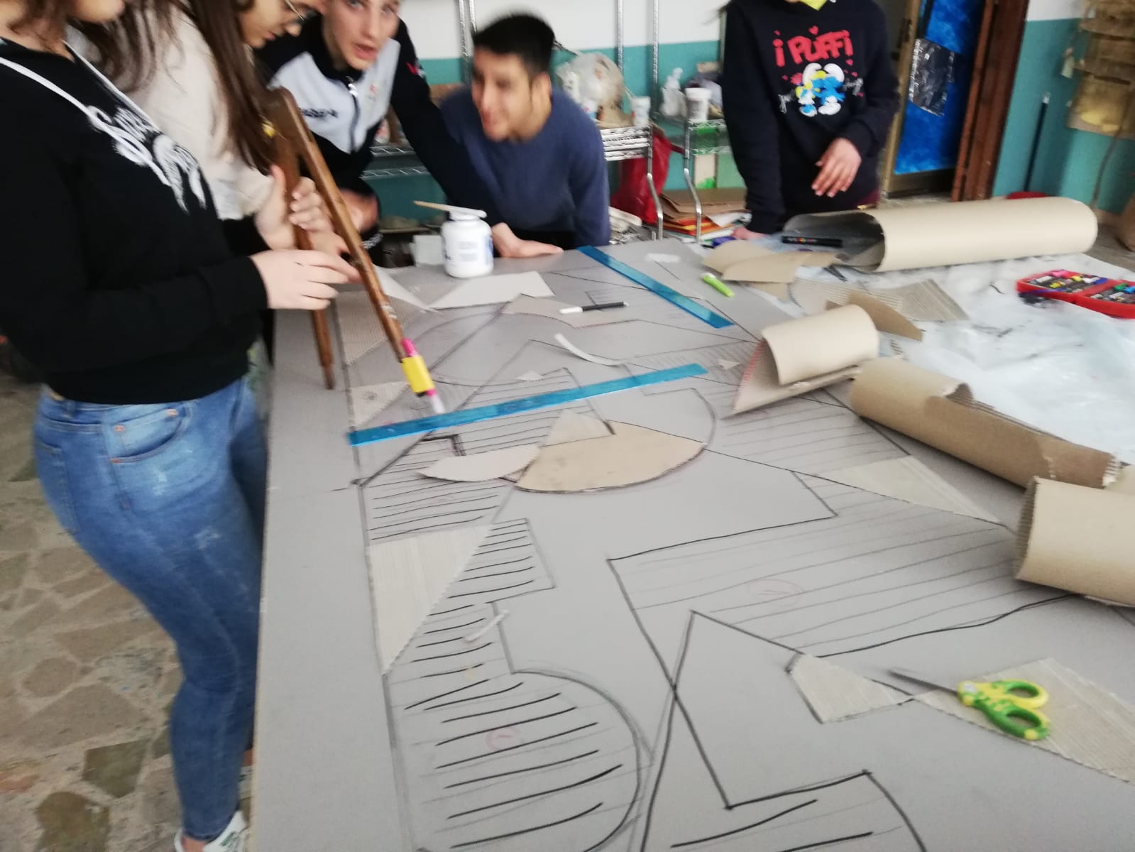 Bozzetto futurista - Partendo da un bozzetto futurista di cm 4 x 10 esposto in una mostra dedicata al pittore Pippo Rizzo tenutasi a Palermo nel 2019, si è provveduto a sviluppare un pannello di cm 80 x 180 cm. Con il cartone ondulato ad ogni area è stato assegnato un ritmo, un'altezza in spessore, ritagliando e incollandi più volte le sagome delle relative parti. Infine per assegnare i colori che richiamasseri morfemi tipici della corrente futurista i ragazzi hanno ridisegnato a mano libera il pannello ancora neutro, per consentire ad ognuno di operare le opportune prove di colore - Tecnica cartone ondulato e colla vinilica su pannello di faesite, idropittura e vernice spray per le parti simil metalliche.
