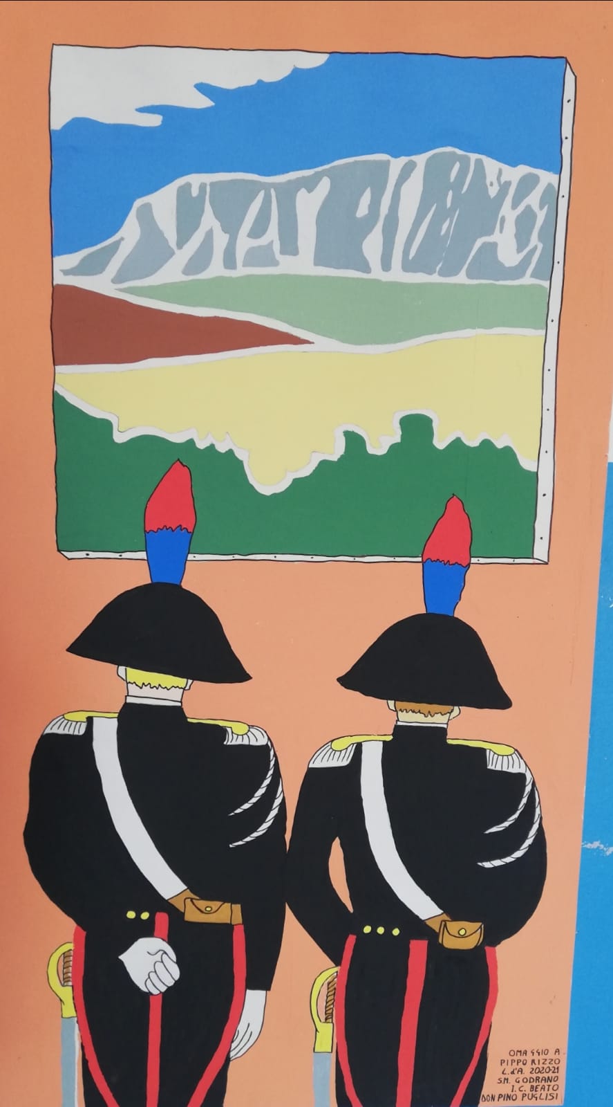 Carabinieri di spalle e Rocca Busambra - In continuazione con le attività già realizzate nell'ambito del nostro Progetto Erasmus+ TALKSCAPES, si è proceduto a una reinterpretazione della produzione artistica del pittore Pippo Rizzo dal secondo dopoguerra. I carabinieri di spalle costituiscono infatti una caratteristica specifica dell'autore citato, spesso raffigurato anche nelle copertine dei libri Sellerio del mastro Camilleri. L'adattamento unisce l'immagine nota al paesaggio iconico di Rocca Busambra.