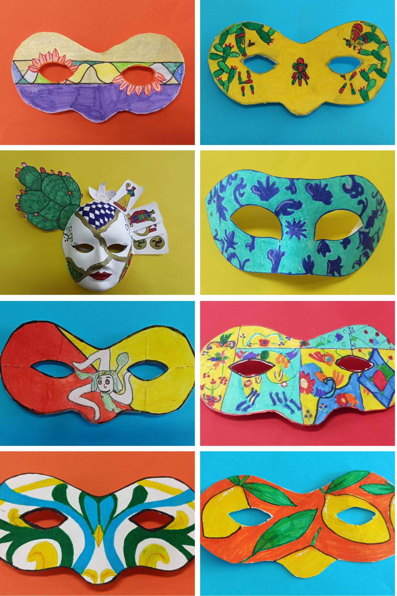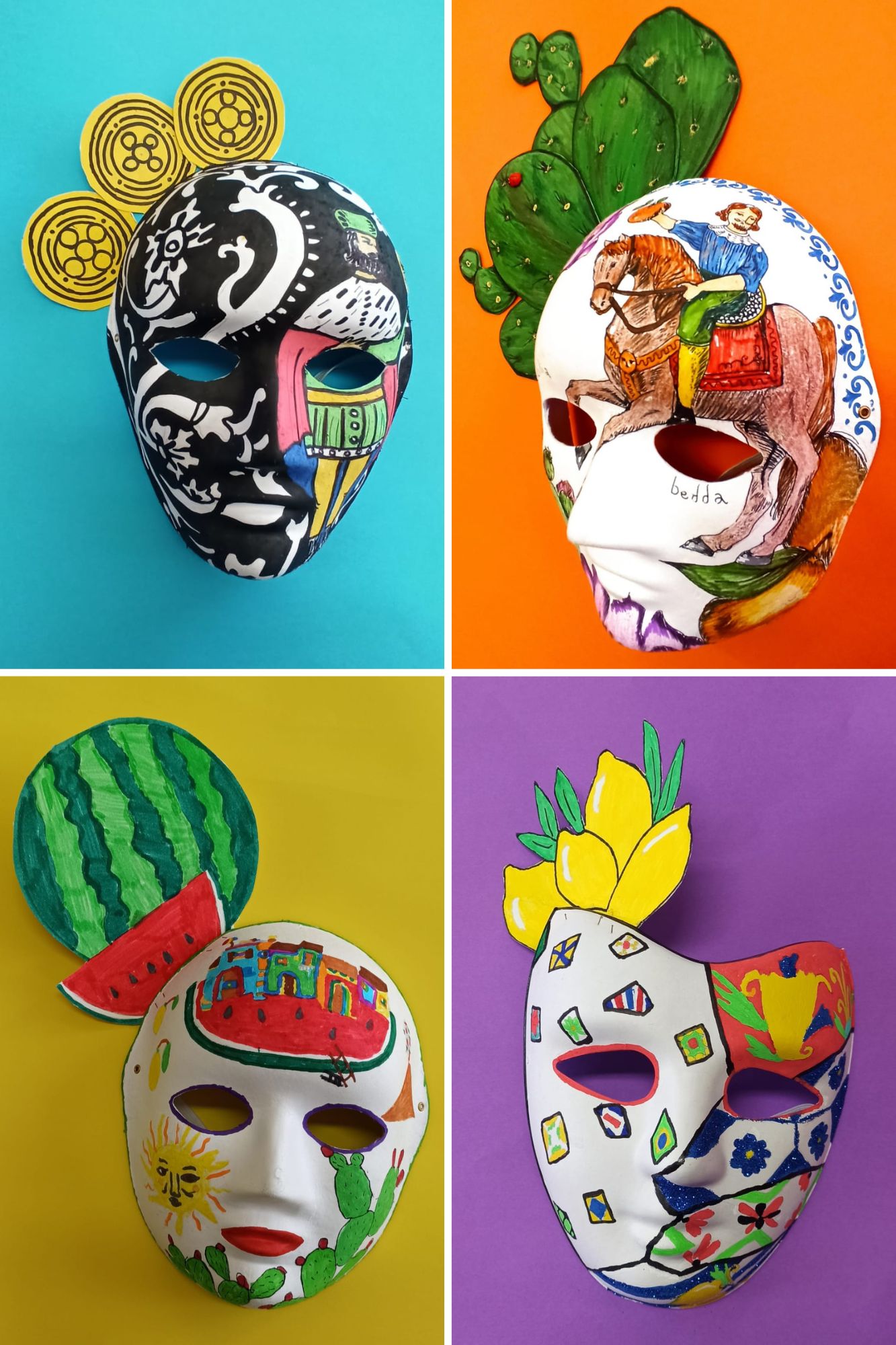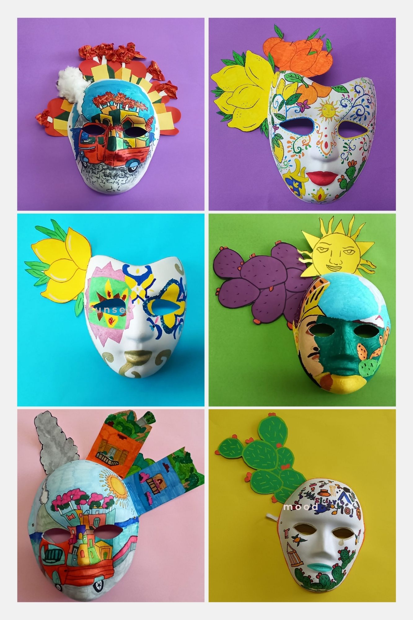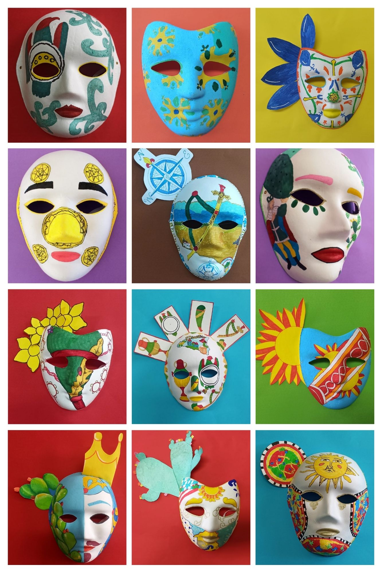 Gli alunni e le alunne della classe 1 B hanno riportato sulle maschere i simboli iconici della Sicilia, gli "odori" e i colori della propria terra, gli alunni e le alunne della classe 2 B hanno lavorato sulla "singolarità" delle carte siciliane e gli alunni e le alunne della classe 3 B hanno riproposto le "sorprendenti" decorazioni delle maioliche siciliane.