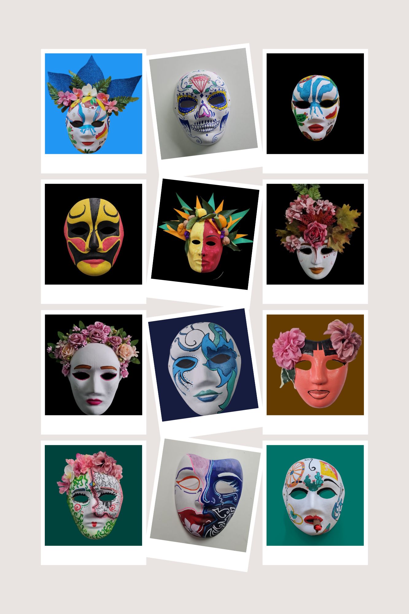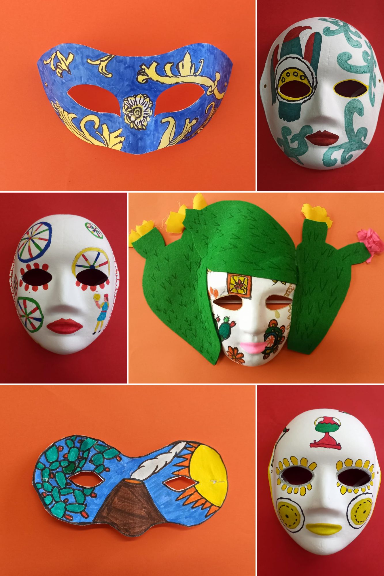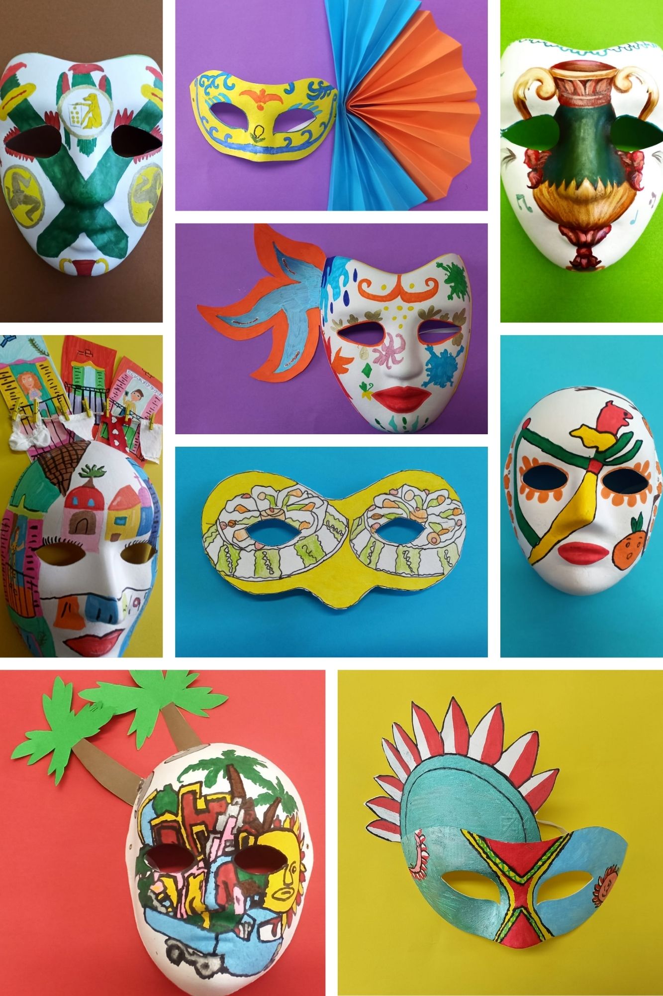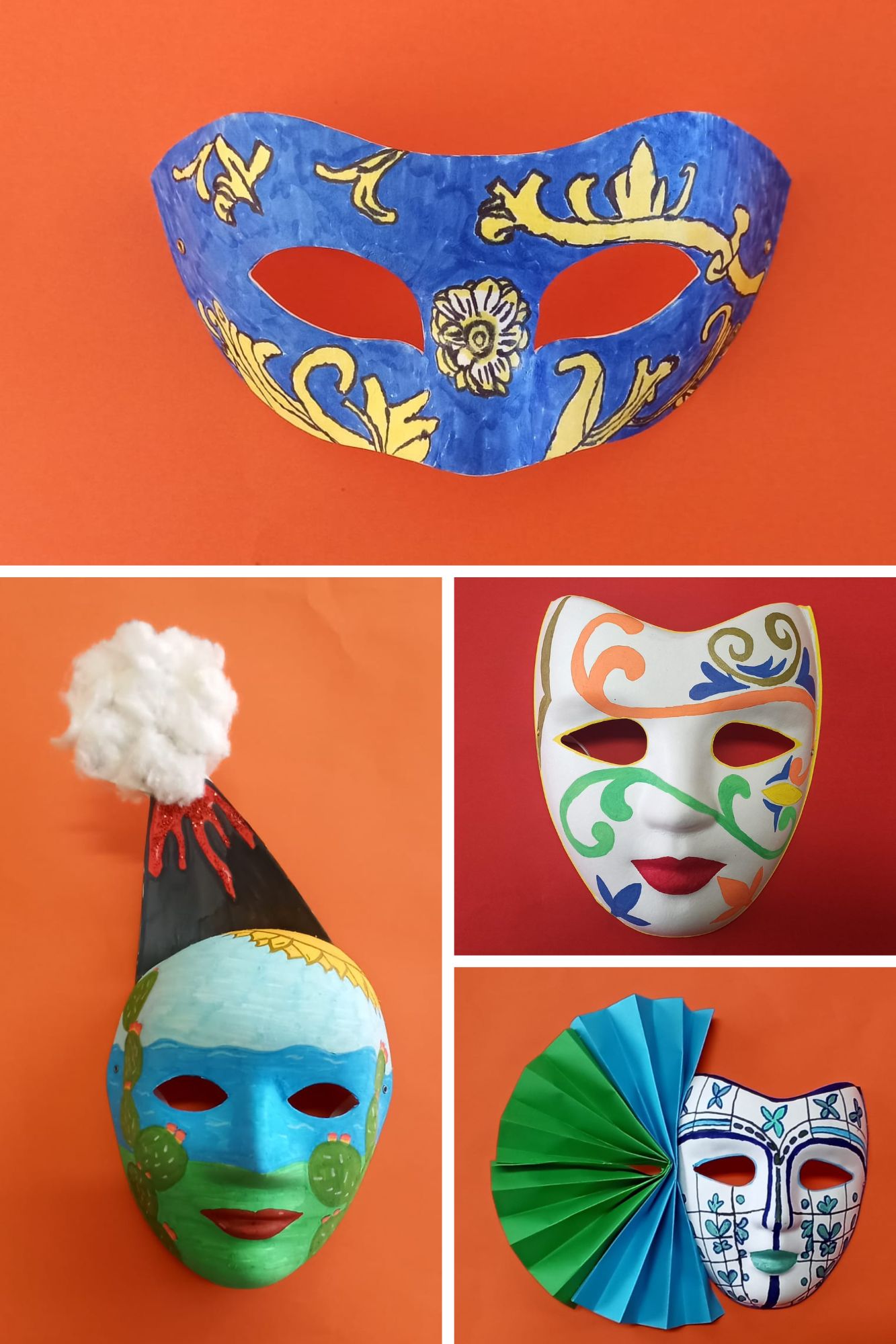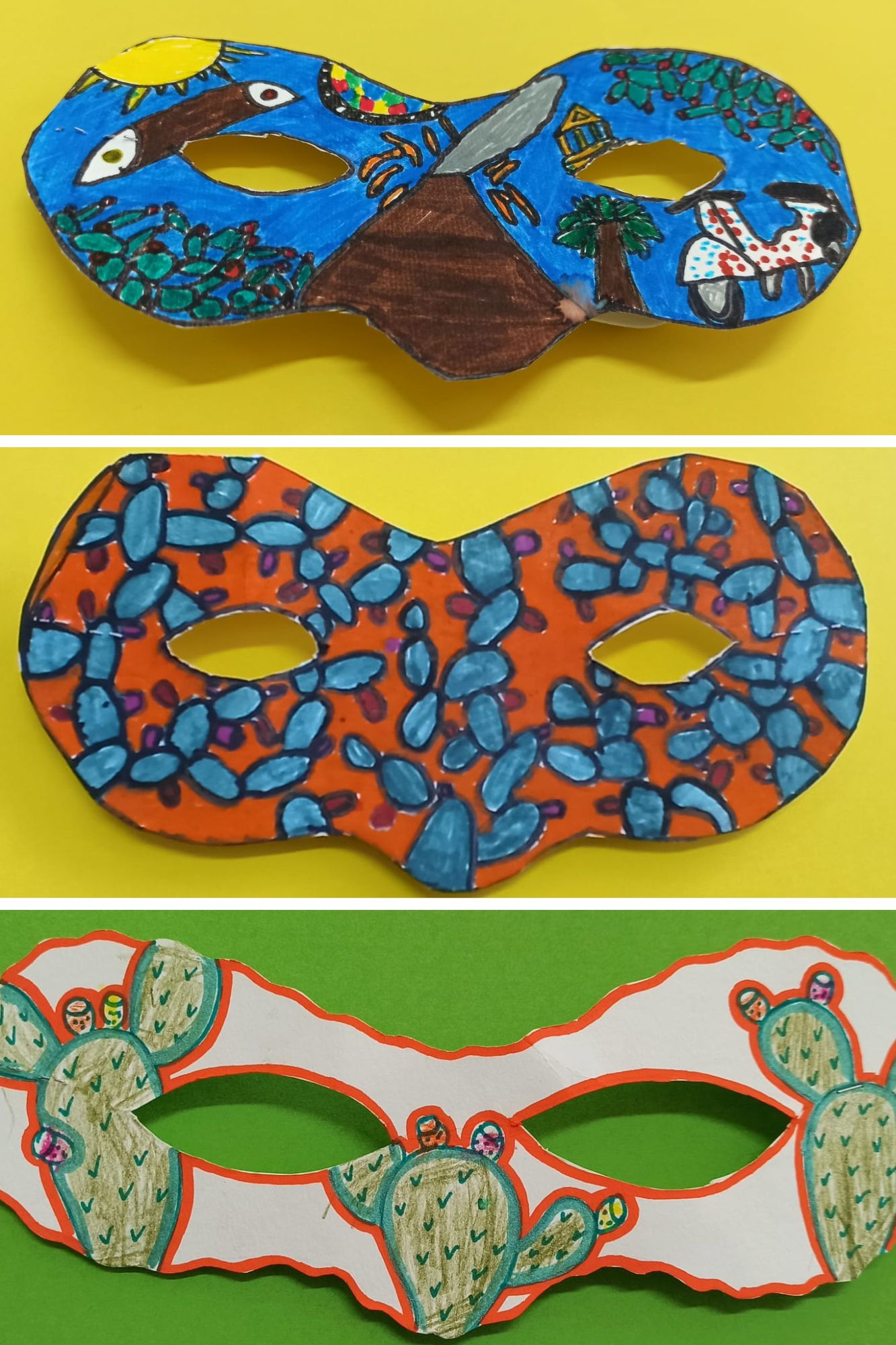 Gli alunni e le alunne della classe 1 B hanno riportato sulle maschere i simboli iconici della Sicilia, gli "odori" e i colori della propria terra, gli alunni e le alunne della classe 2 B hanno lavorato sulla "singolarità" delle carte siciliane e gli alunni e le alunne della classe 3 B hanno riproposto le "sorprendenti" decorazioni delle maioliche siciliane.