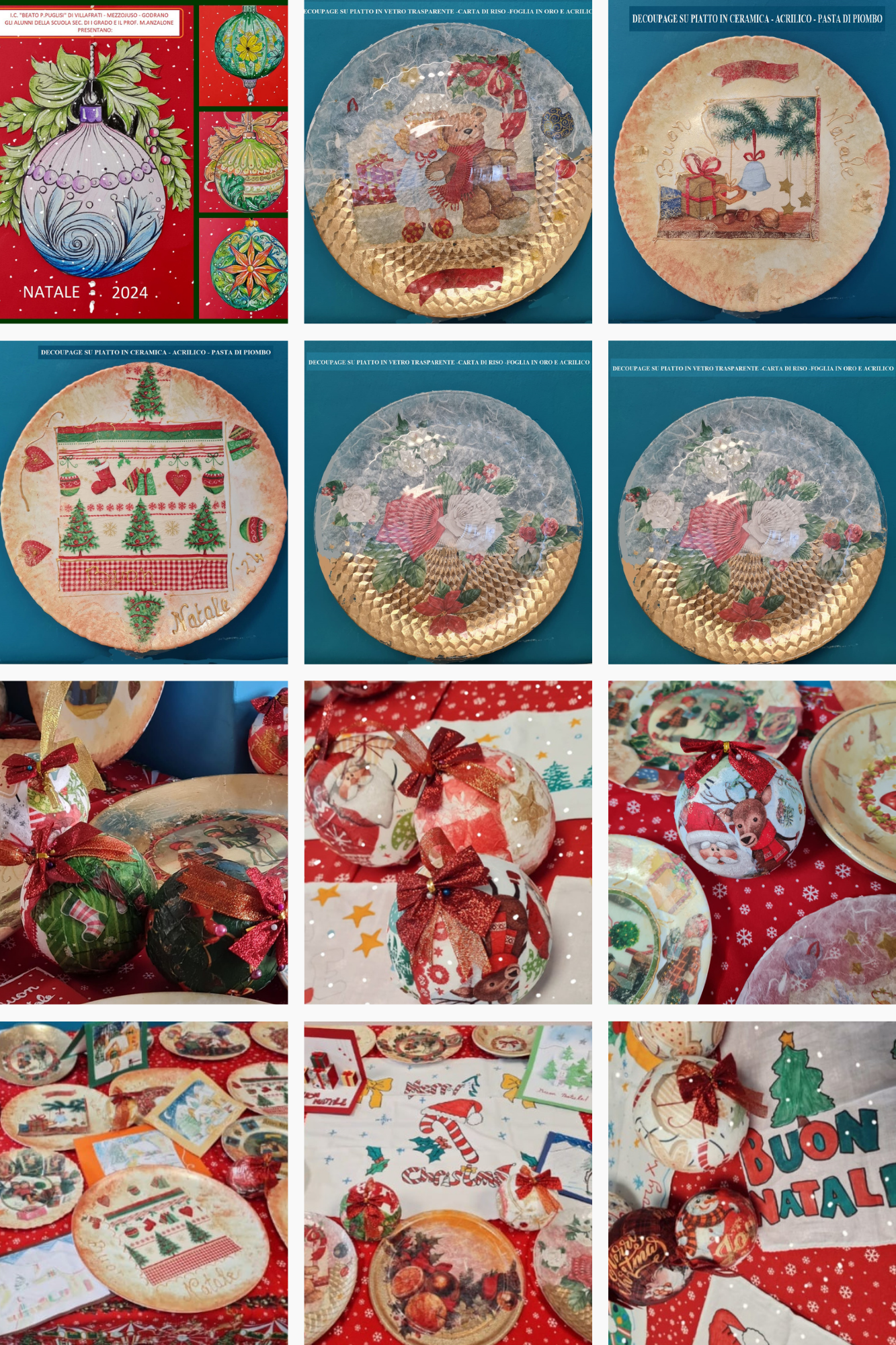 • Gli alunni delle classi seconde, hanno decorato dei piatti in ceramica e in vetro trasparente, con la tecnica del decoupage, carta di riso, foglia in similoro, pasta di piombo e colori acrilici. Inoltre, hanno realizzato con la carta velina colorata e il cartoncino nero, delle finte vetrate con soggetti natalizi.